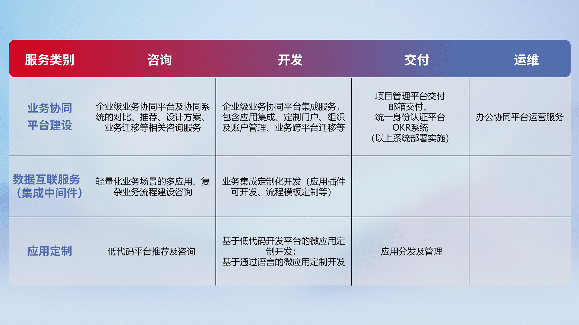 针对钉钉、、、企微、、、IDaas等平台级产品提供产品的规划、、方案、、、、交付、、、、定制化开发等服务,,,实现如统一协同办公、、、智能客户服务、、混合会议管理、、、智能数据查询、、、等业务场景,,实现数字化转型。。。